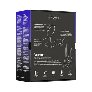 Vector+ is an adjustable-fit prostate massager, designed and engineered in collaboration with leading clinical sexologists to stimulate the prostate and the perineum simultaneously, creating a new advanced kind of climax. A tailored fit: The unique adjustable-fit design makes Vector+ the most mind-blowing prostate massager that precisely hits the right spot. Dual stimulation: Two motors stimulate the prostate and perineum simultaneously, for a new advanced kind of climax. App & Remote Connectivity: Play together with the free We-Vibe app to give your foreplay extra spark across a room or a continent, or use the remote provided. Expertly designed: Vector+ was developed in collaboration with top sexual wellness professionals, utilizing valuable expertise for the ultimate prostate play Features Adjustable fit Dual motors App & remote control Pleasure shape Flexible bas 4 intensity levels, 6 pattern modes Whisper quiet Waterproof Rechargeable Body-safe silicone Low power alert Magnetic USB charging Up to 2 hours of play Charge time: 90 minutes Battery type: USB rechargeable lithium-ion battery Material: Body-safe silicone, produced without phthalates, BPA or latex Run Time: 120 min Charge Time: 90 min Waterproof: IPX7 Product dimensions: 106 mm x 106 mm x 30 mm Warranty: 2 YearsBox contains: Vector+ prostate vibrator, USB charging cable, remoteccontrol, quick start guide, safety instructions, lubecsample, cotton storage pouch
